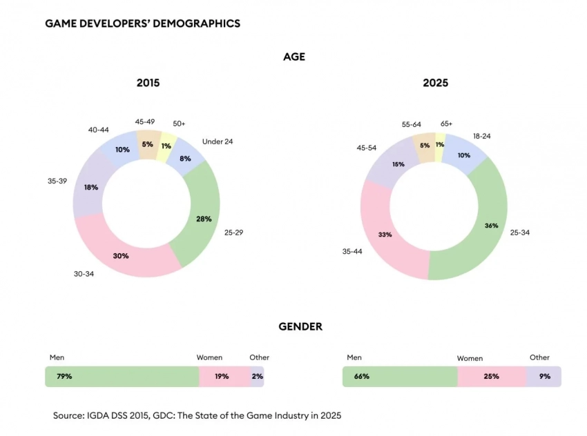 • Меняется не только средний возраст. В 2015 году женщины составляли лишь 19% от общего числа разработчиков игр, но в 2025 году этот показатель подскочил на 6%.
