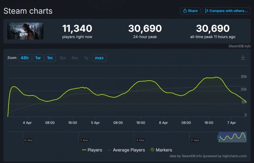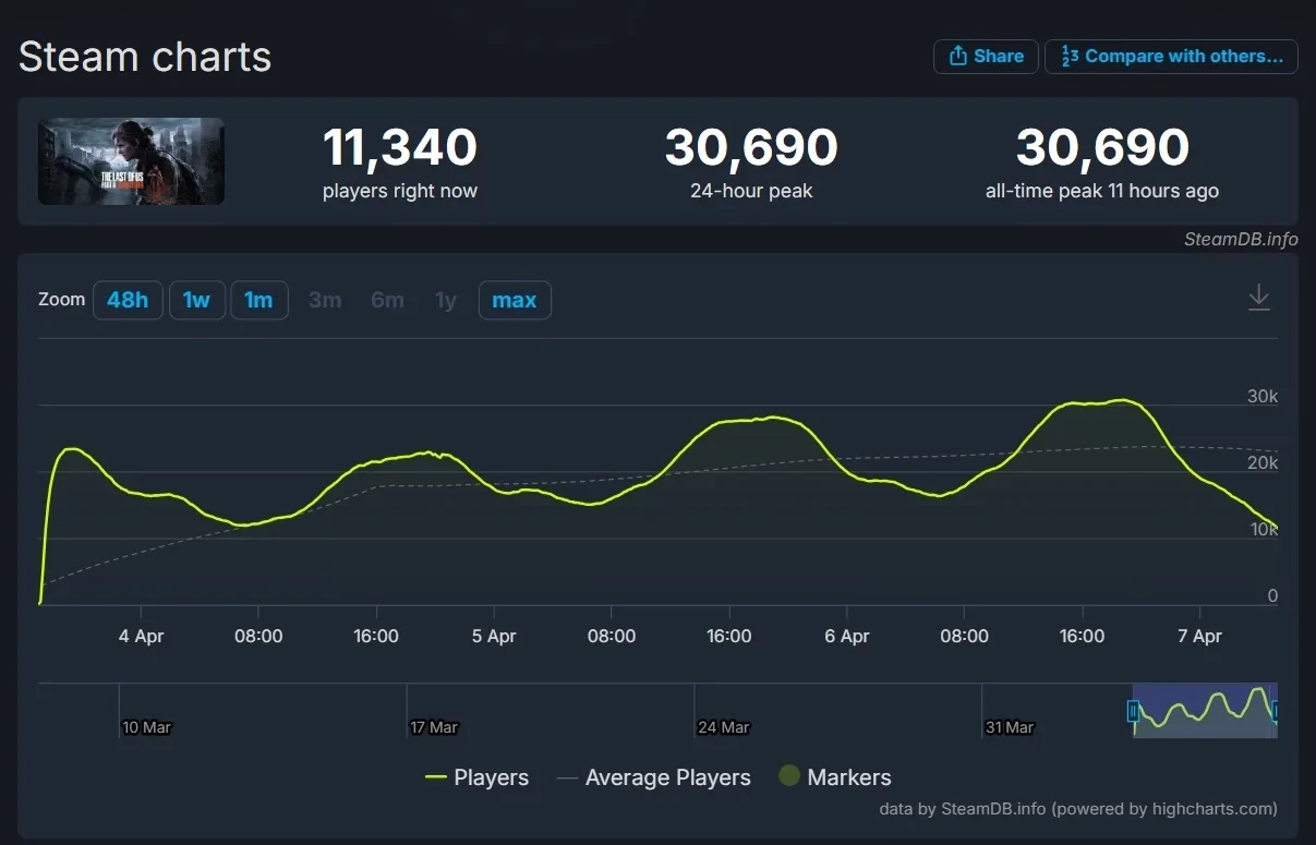 Несмотря на отличный приём, пиковый онлайн ремастера The Last of Us Part 2 в Steam достиг всего 30 690 игроков одновременно.