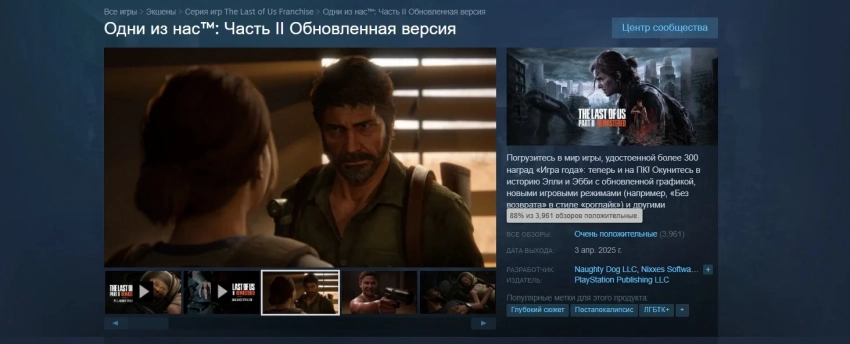 И, как мы видим, пользовательский рейтинг у ремастера The Last of Us: Part 2 «очень положительный». На игру написано почти 4 тыс обзоров, и её рекомендуют к покупке в 88%.
