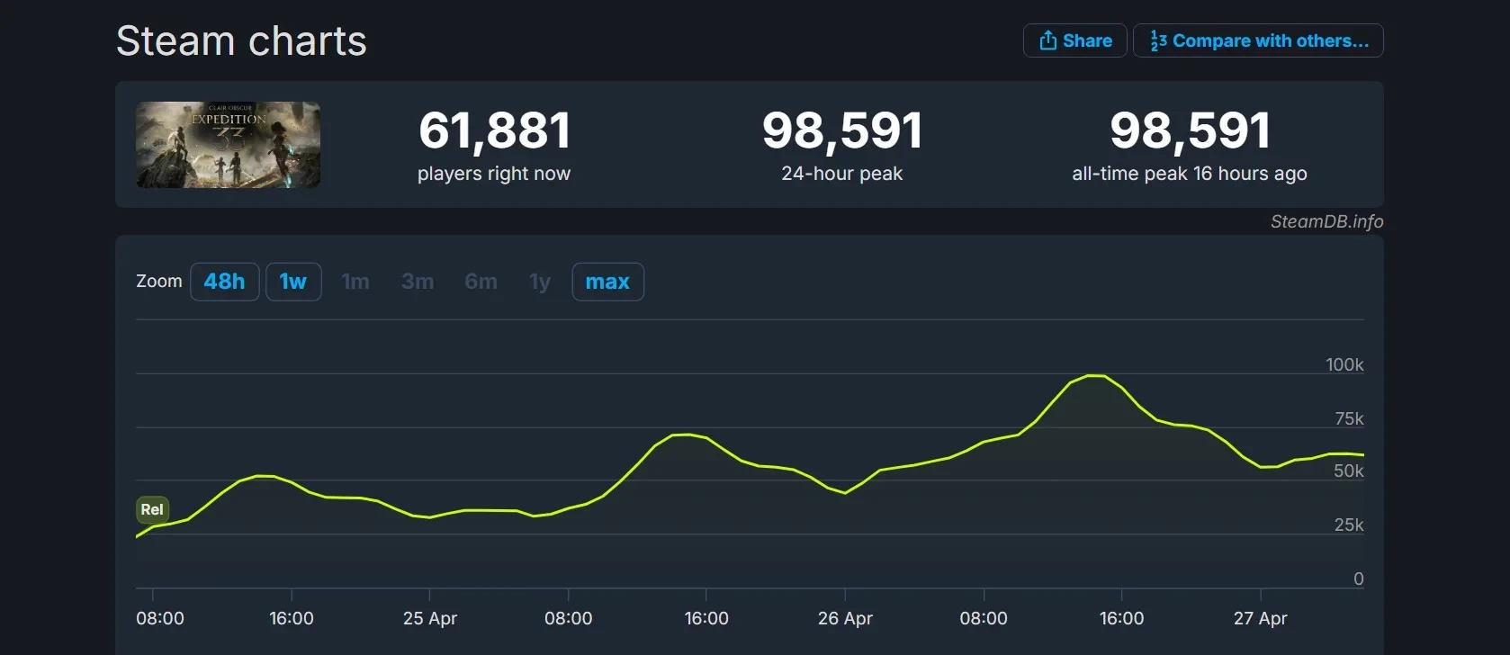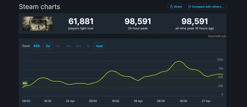 Главные новости » Эксклюзив » Пик онлайна Clair Obscur: Expedition 33 в Steam почти достиг отметки в 100 тысяч игроков