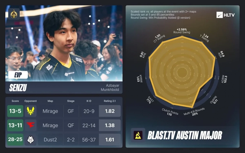 Азбайар «Senzu» Мунхболд из Монголии помог своей команде The MongolZ сделать огромный шаг, проявив себя как зрелый и уверенный игрок. Его рекордные 56 убийств на Dust2 останутся в памяти болельщиков как одно из самых ярких событий турнира.