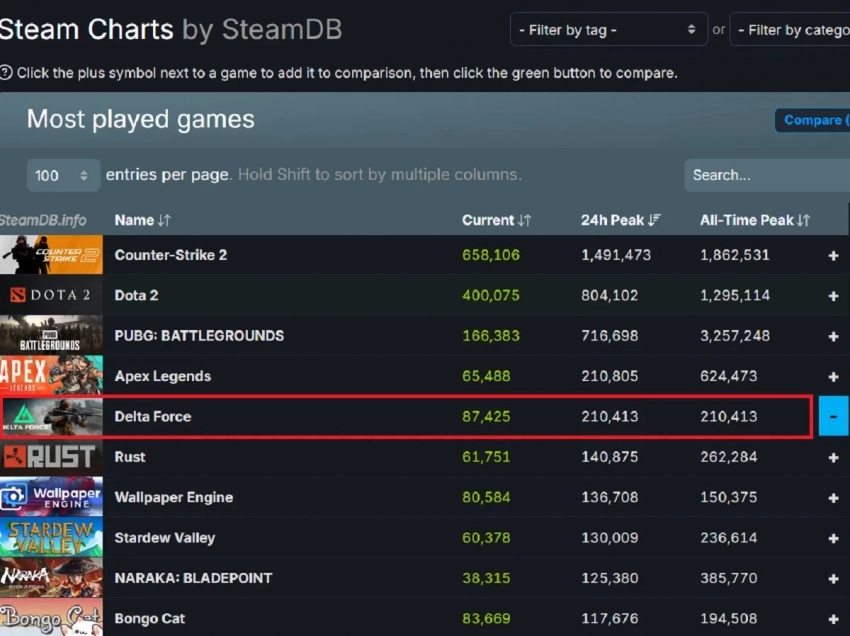 Прямо сейчас Delta Force занимает 5-ю строчку в общем рейтинге по количеству игроков за последние 24 часа. Шутер уступает только Counter-Strike 2, Dota 2, PUBG: Battlegrounds и Apex Legens.