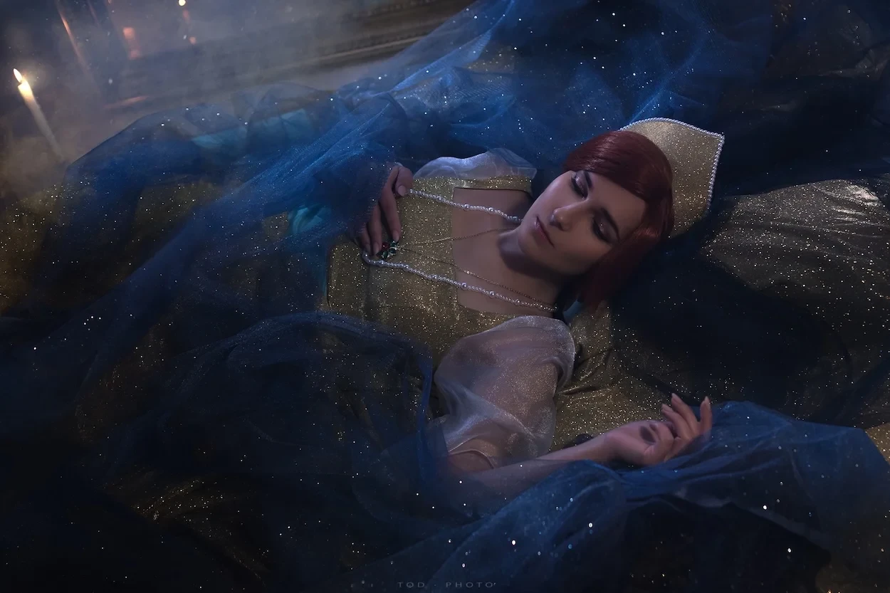 Волосы Анастасии уложены в изящную прическу, часто дополняемую тиарой или украшениями, которые подчеркивают её королевский статус. Фотограф Елена Будеркина запечатлела образ.