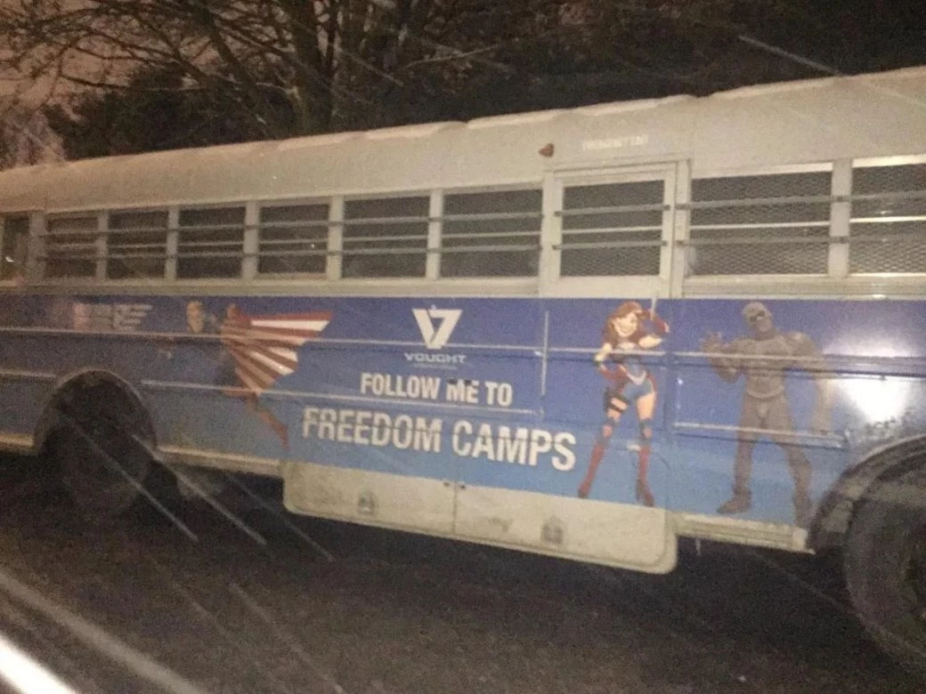 На фотографиях мы видим в основном машины: школьный автобус, разукрашенный приглашениями в Лагеря свободы, джип с изображениями Teenage Kix, а также принадлежащий Vought полицейский фургон. Всё это наводит на мысль, что нас ждут весьма мрачные события.