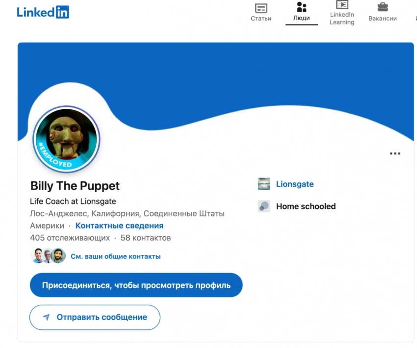 Забавным образом у куклы появилась и «своя» старница на сервисе LinkedIn — Билли якобы работает «инструктором по персональному росту» на студии Lionsgate. Опыт работы, к слову, составляет целых 20 лет.