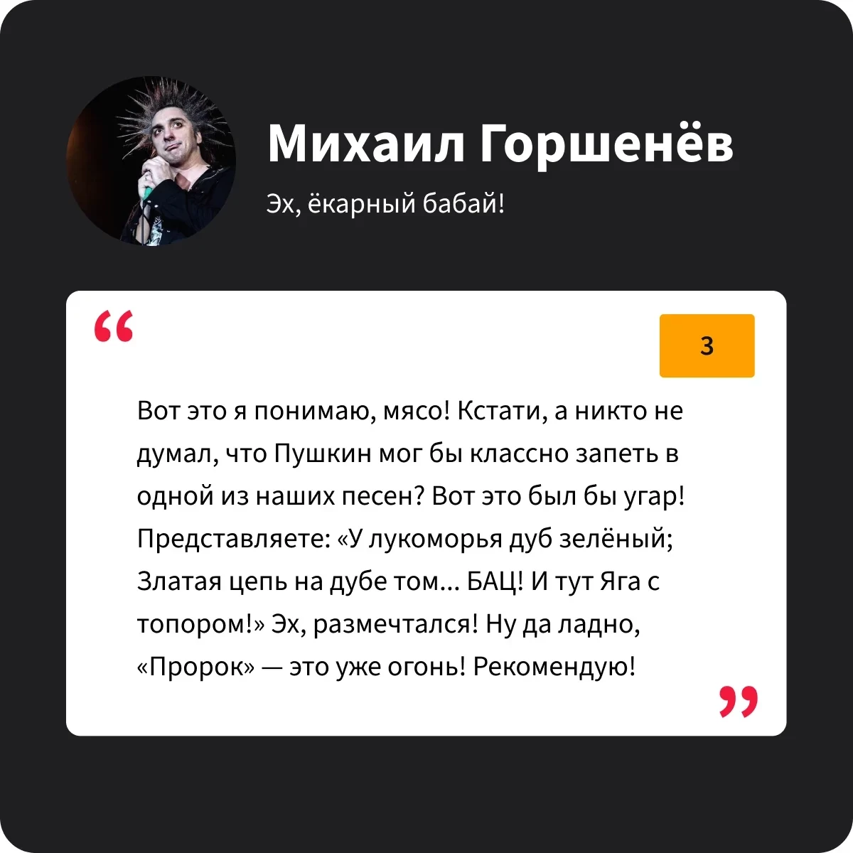 Участнику группы «Король и Шут» фильм «Пророк» зашёл, и ещё как! Особенно идея сделать Пушкина героем мюзикла. По словам Горшка, как будто Пушкин «сам встал из могилы и схватил микрофон»!