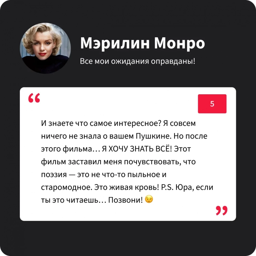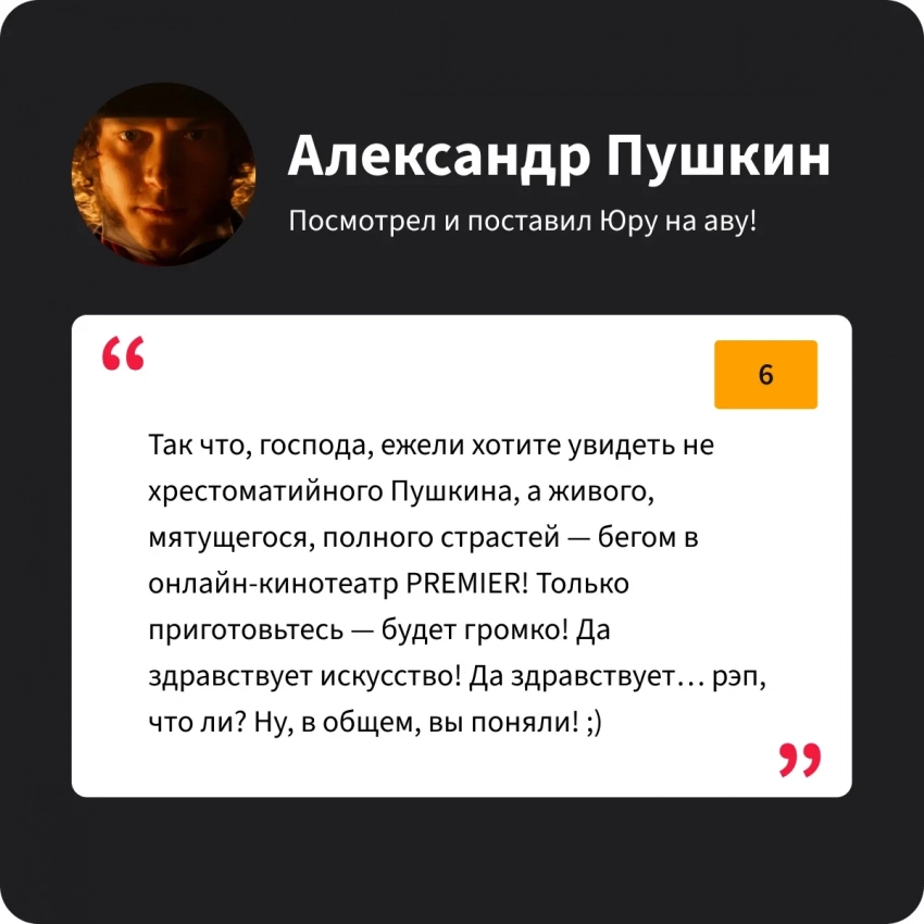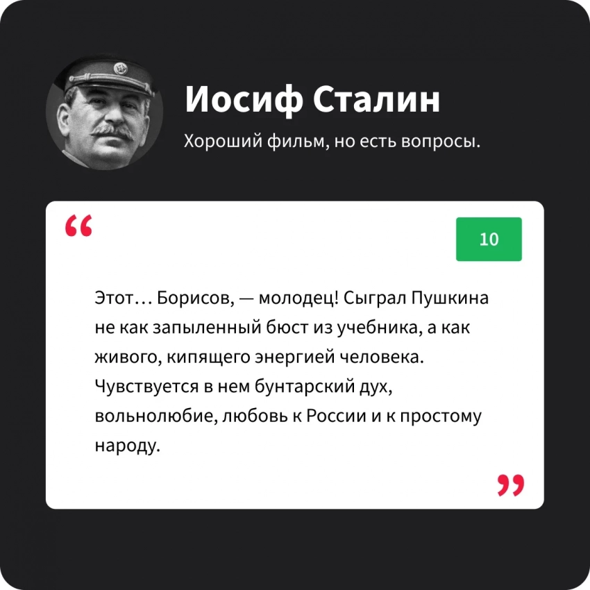 Иосиф Виссарионович фильмом остался доволен, хотя и вначале был ошарашен тем, что в фильме про Пушкина есть рэп. Но потом согласился с тем, что идея достойная, «голос улиц» и вообще молодёжно! Да и Юра Борисов, как всегда на высоте!
