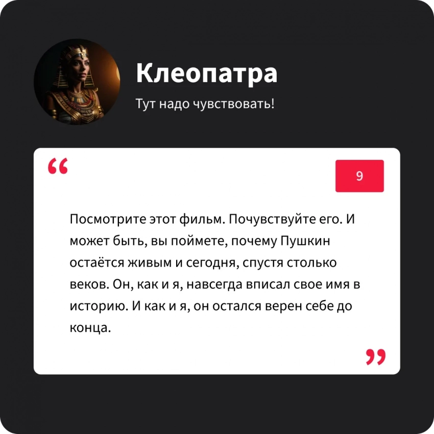 Царице Египта фильм сразу пришёлся по нраву и она назвала его «диковинным зрелищем». Особенно ей запал в душу некий «юноша, с глазами горящими», который играет Пушкина в «Пророке». Царица сказала, что так же когда-то с ровно таким же пылким взглядом бросала вызов римлянам!