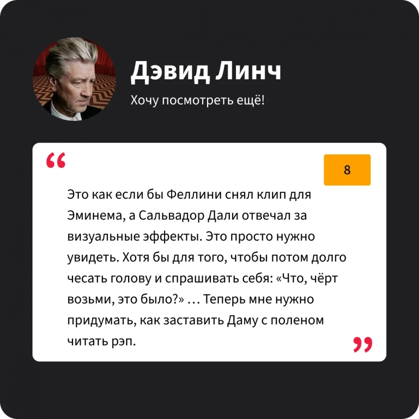 Дэвид Линч фильм глянул, и даже как будто поднял большой палец вверх, а потом сказал, что посмотрел бы ещё раз. Ну, потому что фильм его начал преследовать, как «чашка чертовски хорошего кофе» и «красный бархатный костюм».