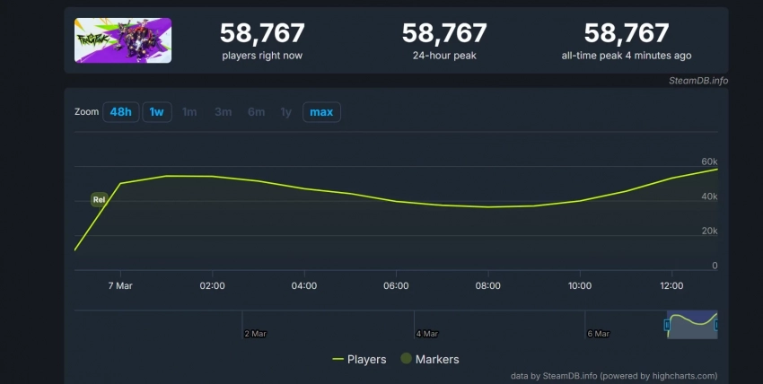 Отметим, что FragPunk доступна в Epic Games Store и собственном лаунчере, однако информация об онлайне будем брать из базы данных Steam. В момент написания новости число единовременных игроков растёт — оно уже приблизилось к отметке в 59 тысяч человек. Это неплохой показатель для дебютной игры (разработчики — Bad Guitar Studio) в новой франшизе.