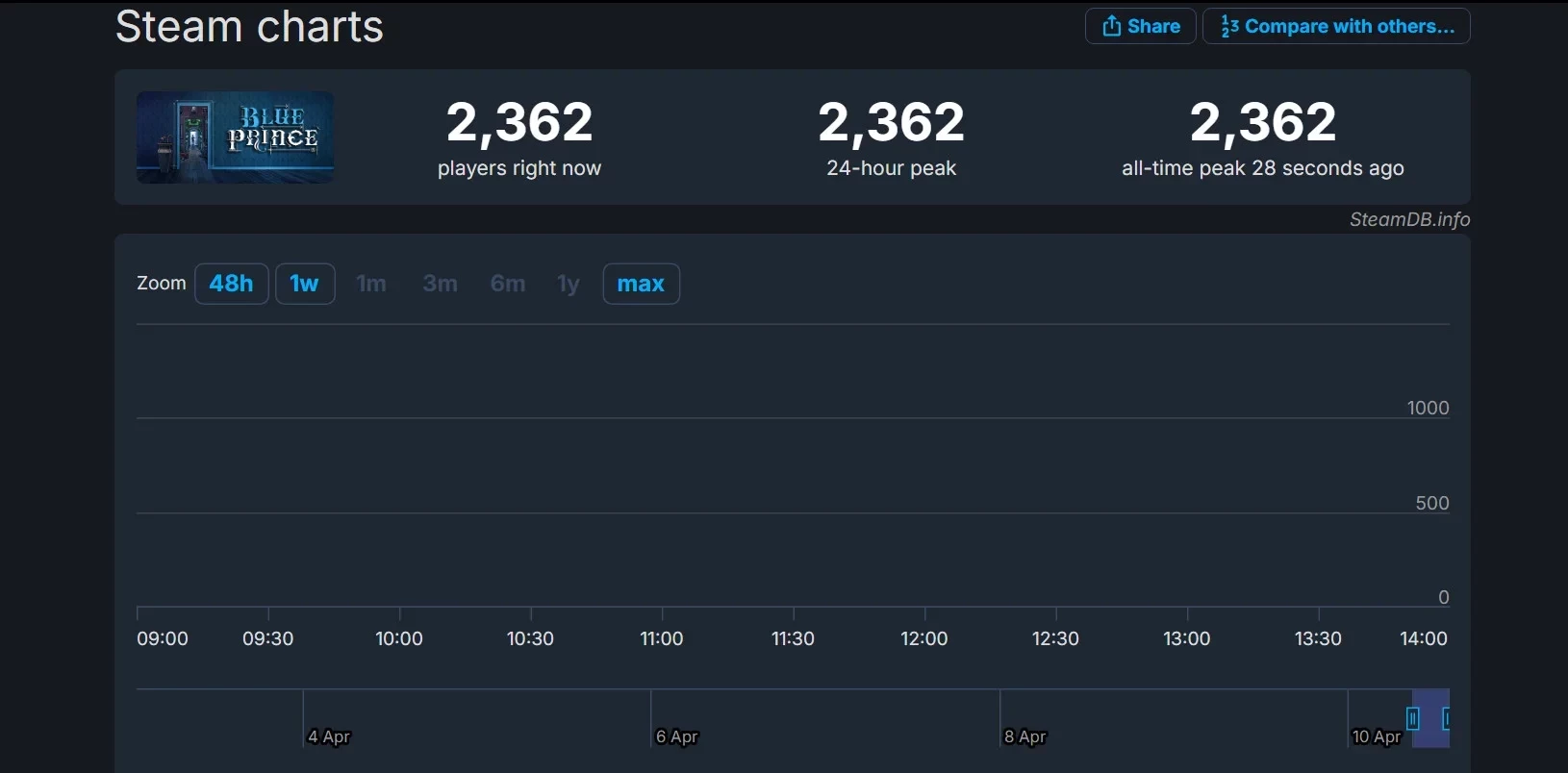 Что касается пикового онлайна Steam, то пока о нём ещё слишком рано говорить. В момент написания новости в Blue Prince находится свыше 2300 человек — число игроков продолжает расти. Головоломка уже успела превзойти недавнюю новинку в лице экшена South of Midnight, чей пик не превысил и 1500 человек.