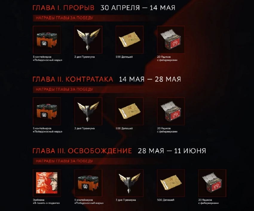 Награды получились сочными. За завершение каждый главы игроки получат контейнеры «Победоносного марша», дни премиума, депеши и не только. Однако операции могут завершиться и неудачей для сообщества — в таком случае призы окажутся скромнее.